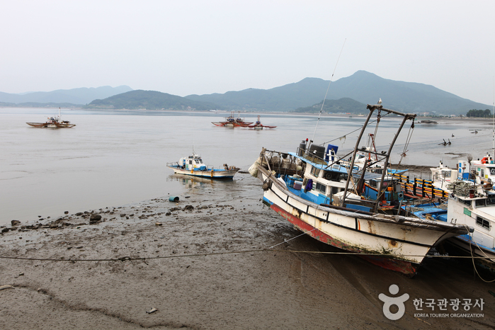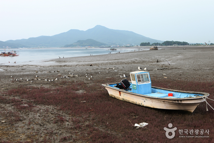 넓은 갯벌 위에 작은 고깃배들이 정박해 있고, 그 위로 바다갈매기들이 무리지어 날아다니는 풍경은 소박하고 전형적인 작은 어촌 마을의 풍경을 연출한다.